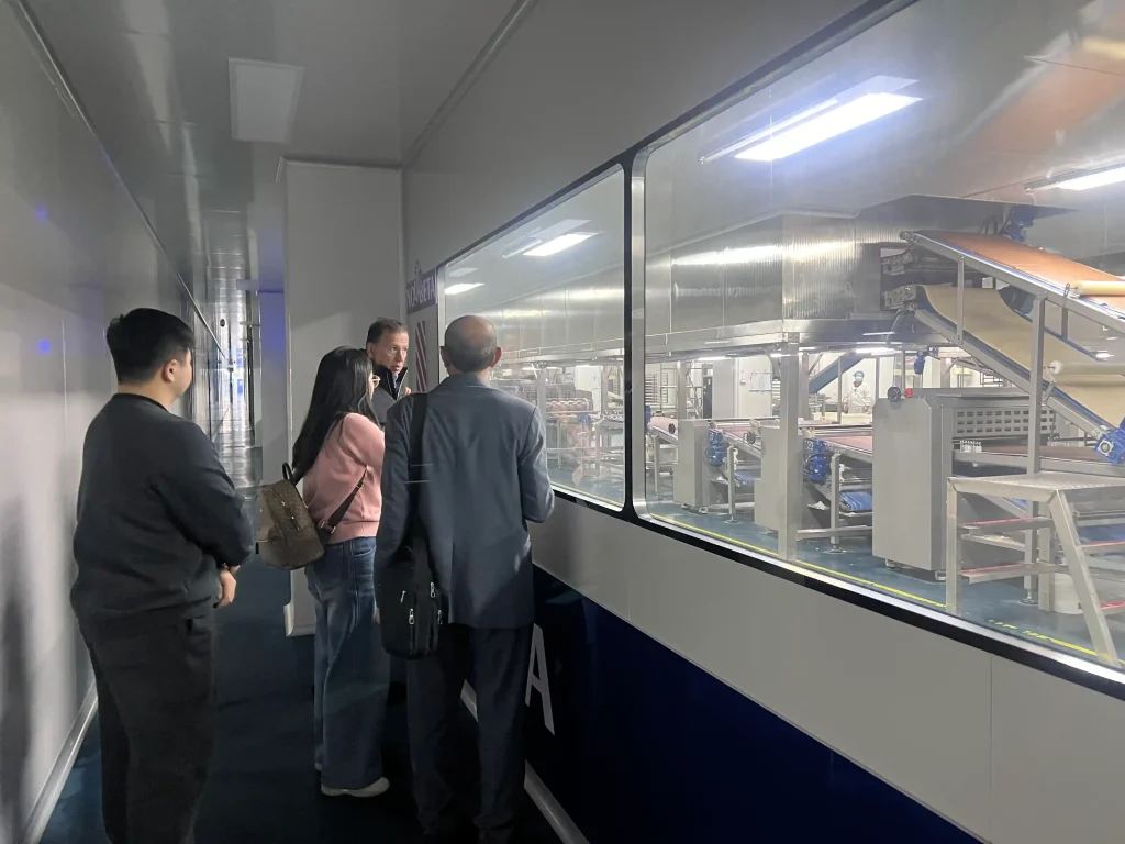 ໃນລະຫວ່າງການຢ້ຽມຢາມ, ລູກຄ້າອີຣັກຄັ້ງທໍາອິດໄດ້ໄປຢ້ຽມຢາມ ພື້ນທີ່ສາທິດການຜະລິດ croissant ກອບເປັນຈໍານວນ ຢູ່ໂຮງງານເຄື່ອງຈັກ Andrew Mafu. ພື້ນທີ່ນີ້ສະແດງໃຫ້ເຫັນເຄື່ອງຈັກຕົວຢ່າງແລະເຄື່ອງກອບເປັນຈໍານວນທີ່ອອກແບບມາສໍາລັບການສ້າງຮູບຊົງ croissant ອັດຕະໂນມັດ, ມ້ວນ, ແລະລໍາລຽງ.