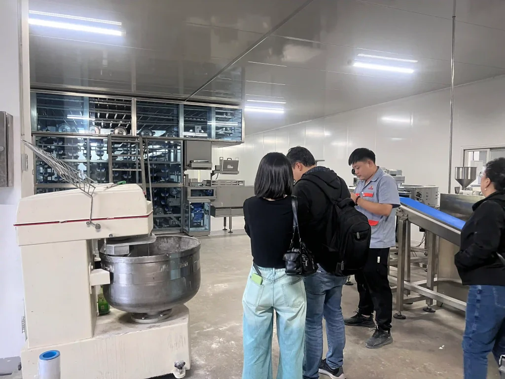 भेट देणाऱ्या ग्राहकांनी कसे ते पाहिले इंजेक्शन मशीन भरणे फॉर्मिंग लाइनसह अखंडपणे कार्य करा — विविध पेस्ट्री उत्पादनांसाठी अचूक फिलिंग वितरण सक्षम करणे. ही मशीन्स चॉकलेट आणि फ्रूट फिलिंगपासून क्रीम-बेस्ड पेस्टपर्यंत विविध प्रकारच्या बाजारातील गरजांसाठी लवचिकता देतात.